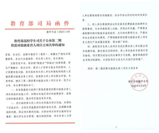 2023年4月6日,教育部高校员工司发布《关于公布第二期供需对接就业育人项目立项名单的通知》(教学司函〔2023〕6号),英国上市公司官网365申报的2个项目,全部获批立项。